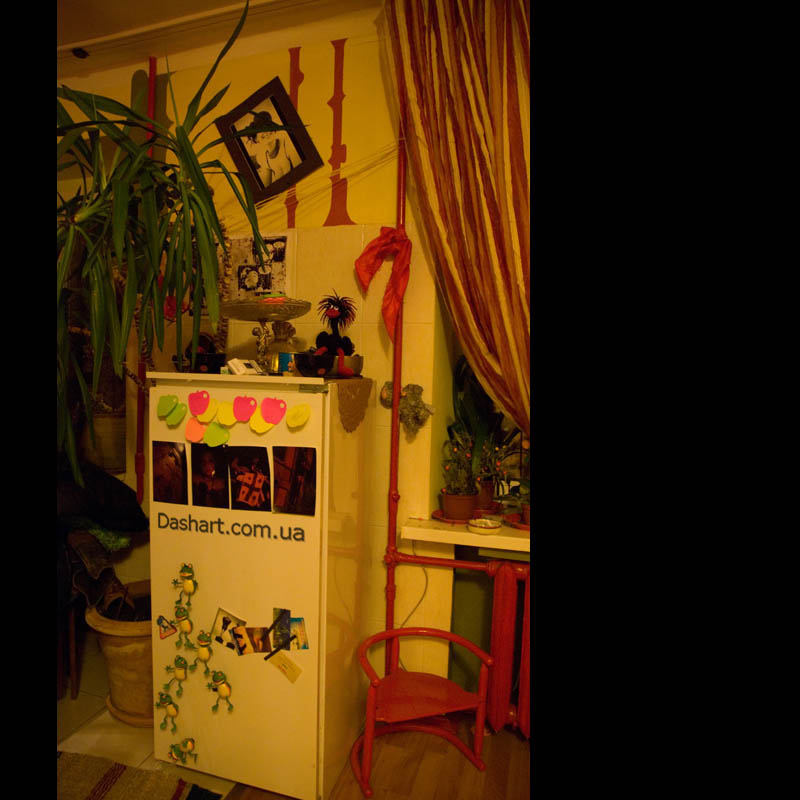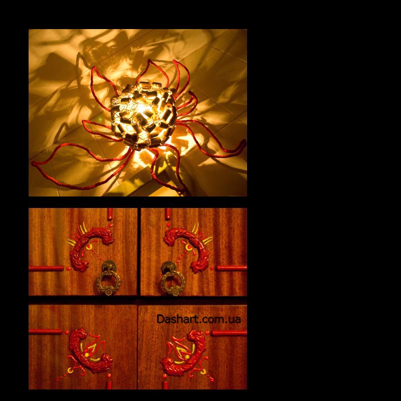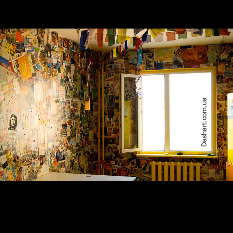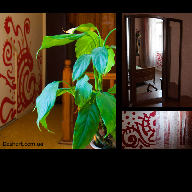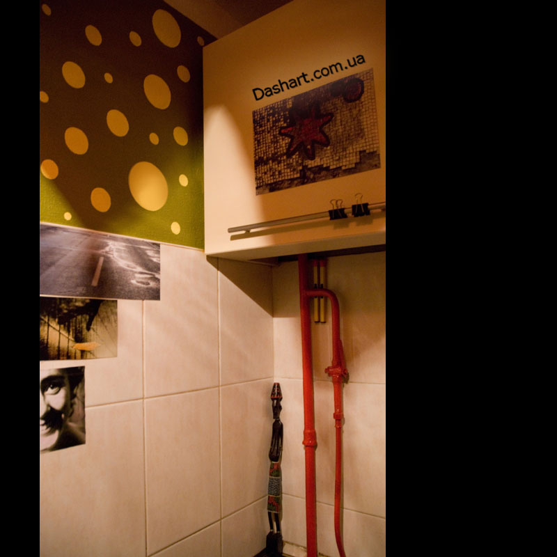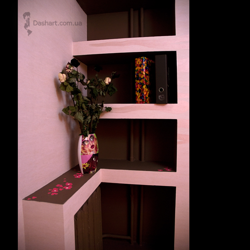 To put an end to this stalemate, I painted skirting boards and water heat batteries red. I use anything as a basis: an old wardrobe, a hand washer, a fridge, remnants of old chairs, broken telephones, a Soviet-style lamp, a mirror, tiles, a door or a window, a set of knick-knacks from your childhood ... stoppers, buttons, or anything else, forgotten and then found in the ceiling cabinet. Furniture designers asked me to pay 200 bucks for a customized book shelf. I nailed two L-bars to a wall, attached two wooden blocks and painted them red to match the radiator, already painted red. Granma's plates were turned red as well: they became excellent saucers for flower pots.