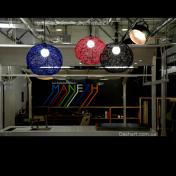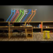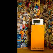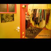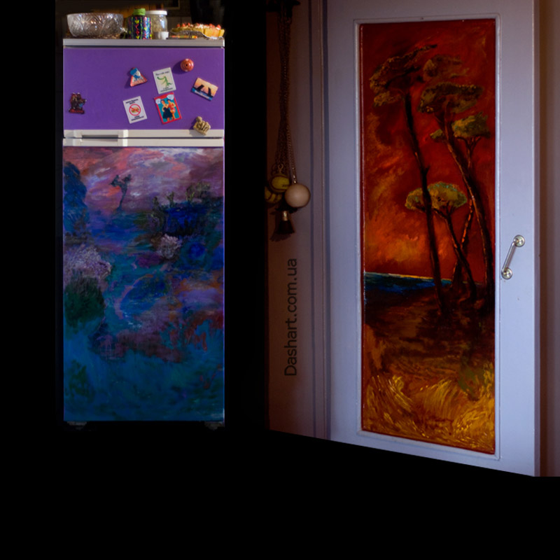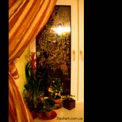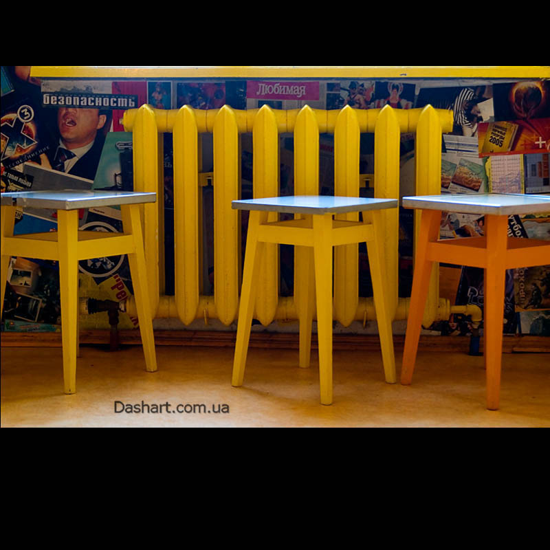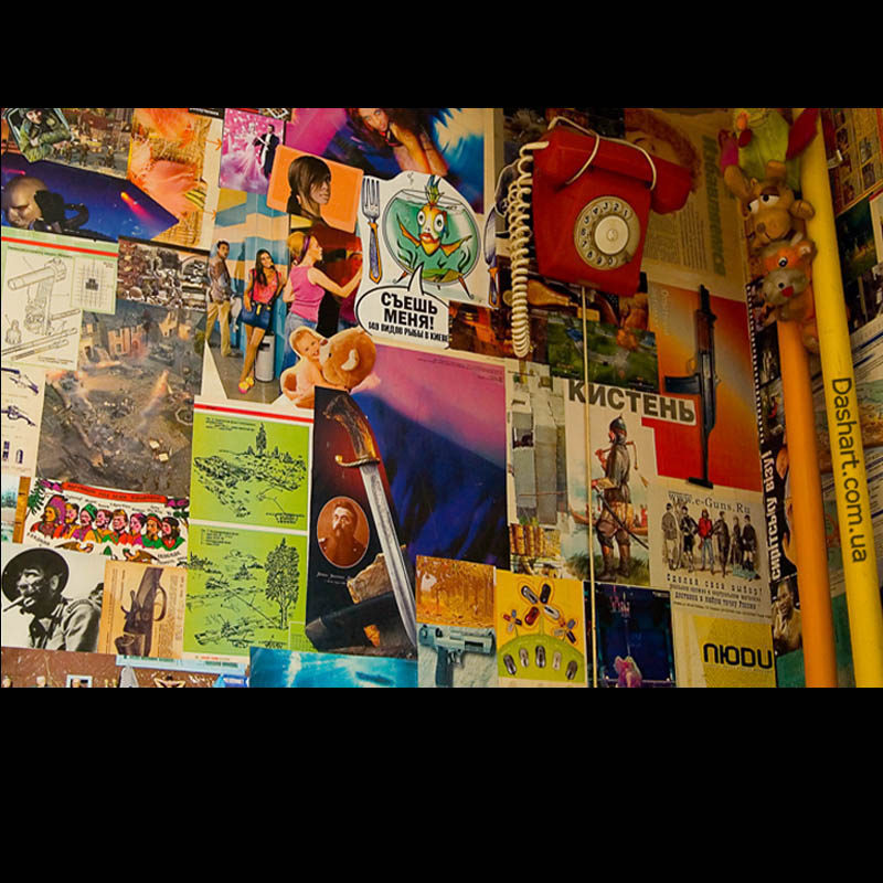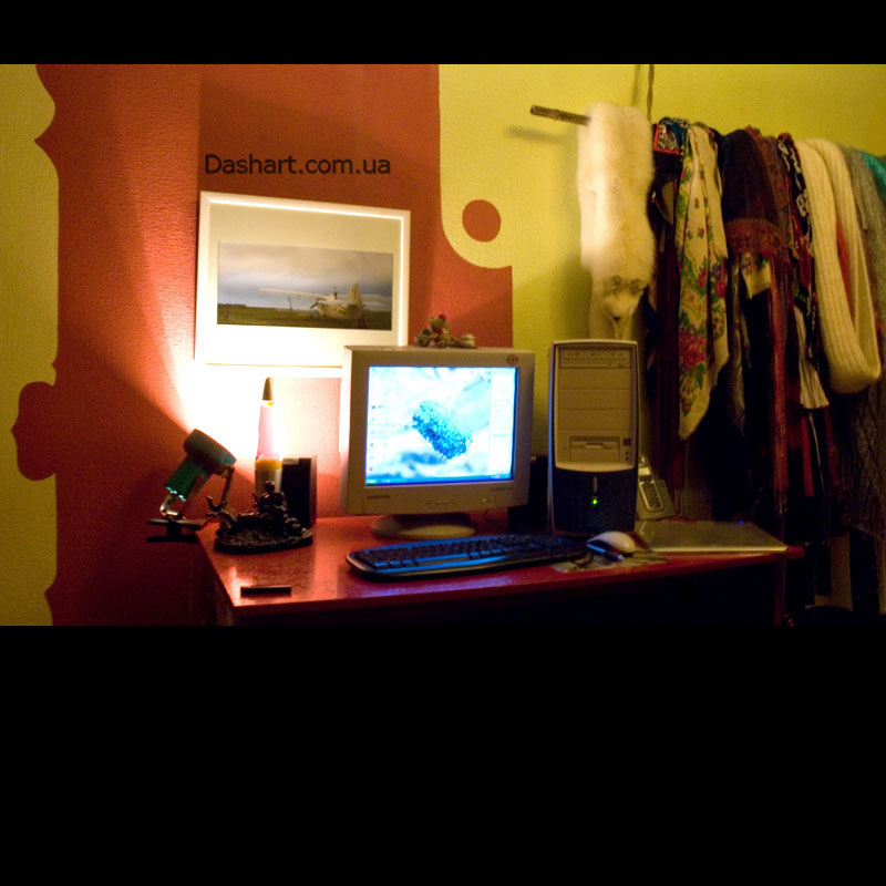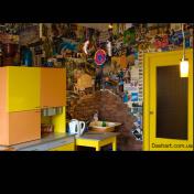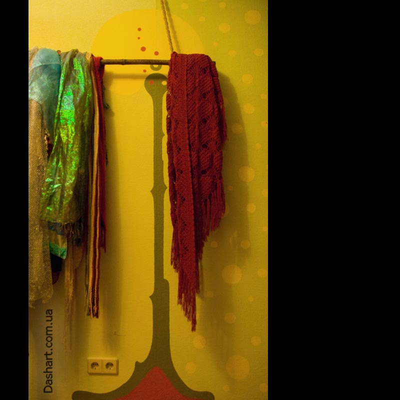 To put an end to this stalemate, I painted skirting boards and water heat batteries red. I use anything as a basis: an old wardrobe, a hand washer, a fridge, remnants of old chairs, broken telephones, a Soviet-style lamp, a mirror, tiles, a door or a window, a set of knick-knacks from your childhood ... stoppers, buttons, or anything else, forgotten and then found in the ceiling cabinet. Furniture designers asked me to pay 200 bucks for a customized book shelf. I nailed two L-bars to a wall, attached two wooden blocks and painted them red to match the radiator, already painted red. Granma's plates were turned red as well: they became excellent saucers for flower pots.