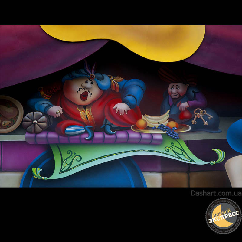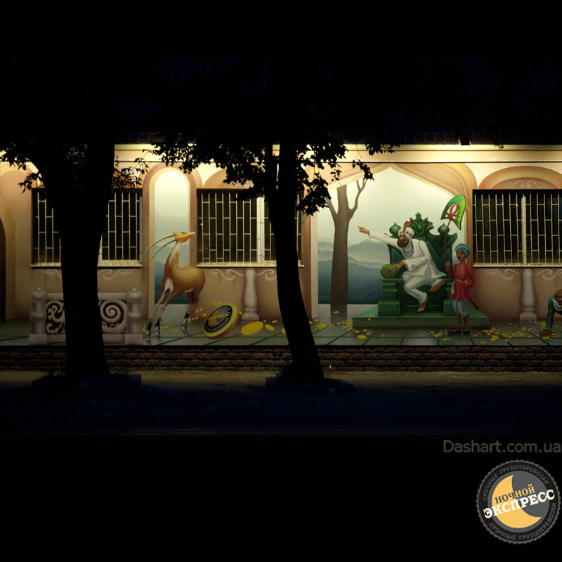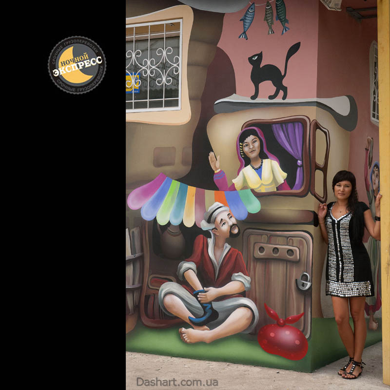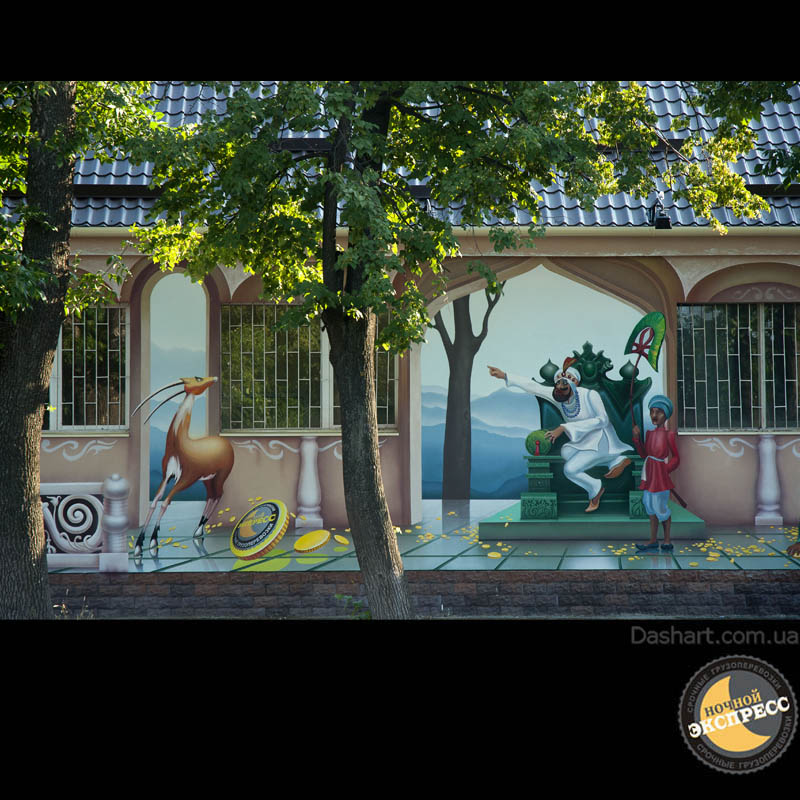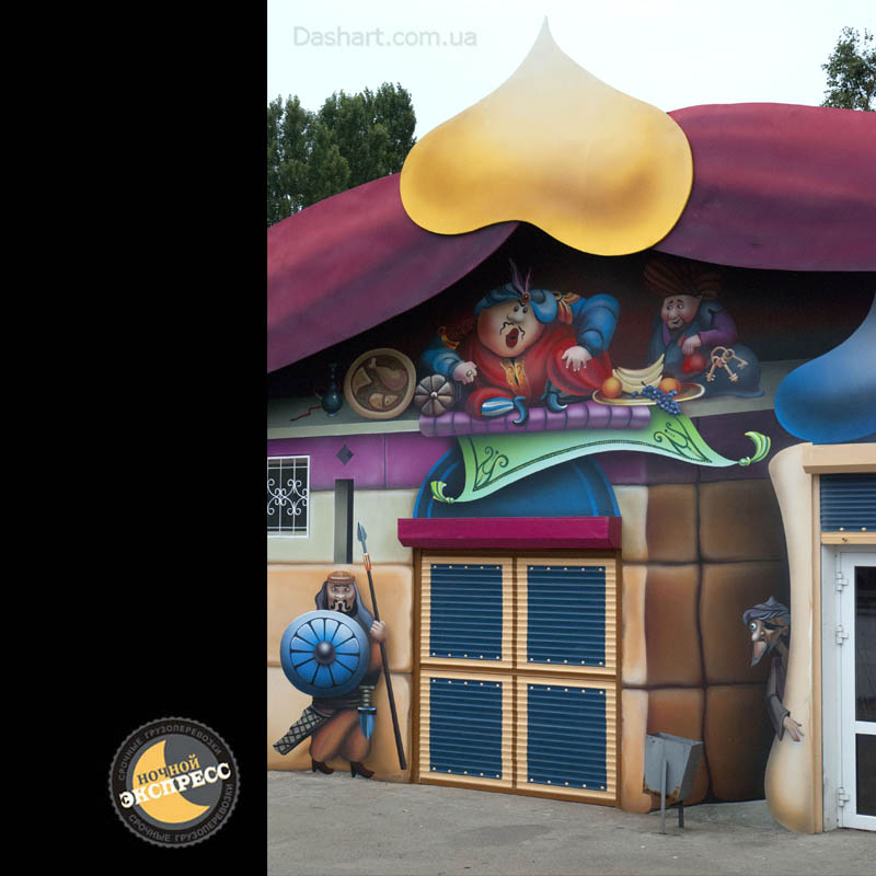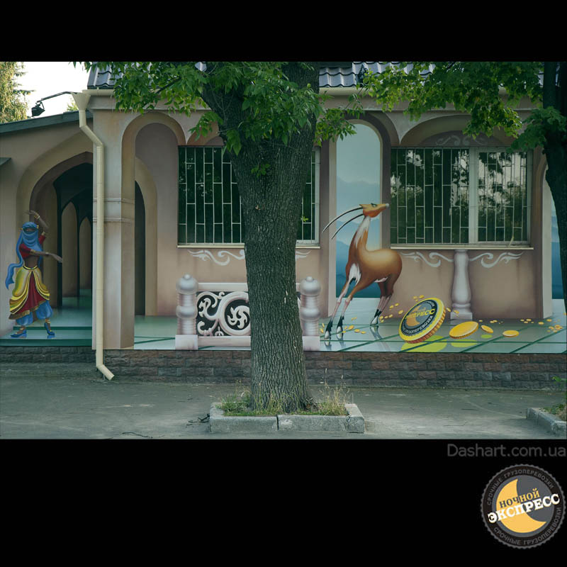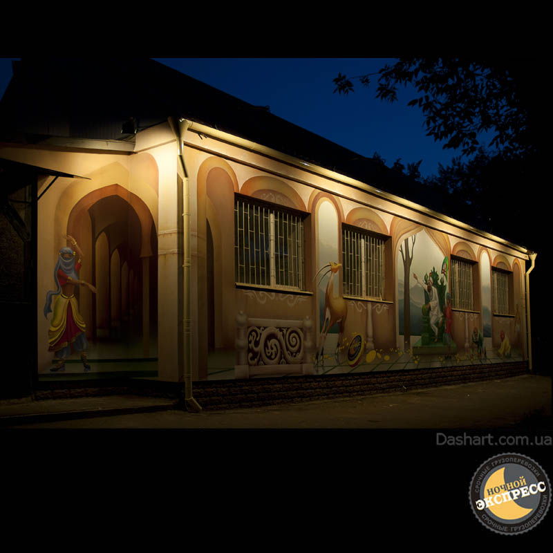 Художественная роспись стен для компании "Ночной Экспресс" долгое время казалась сном, чем угодно, но не реальностью. Оптические иллюзии теперь удивляют прохожих, не ожидающих повстречать летающую тарелку, Громозеку, паровозик из Ромашково, Золотую антилопу, Хаджу Настредина. Из города в город перевозим сказку. Люди в Херсоне, Днепропетровске, Виннице, Черкассах улыбаются чаще, а мы ищем новые методы для того, что бы обмануть Ваши глаза с помощью приемов 3Д аерографии и хорошего заказчика, компании грузовых междугородных перевозок « Ночной Экспресс». Только отпетые романтики могли задумать напомнить окружающим о любимых сказках и детских мечтах.