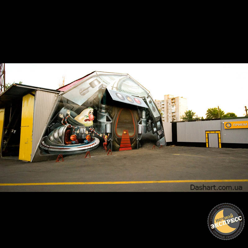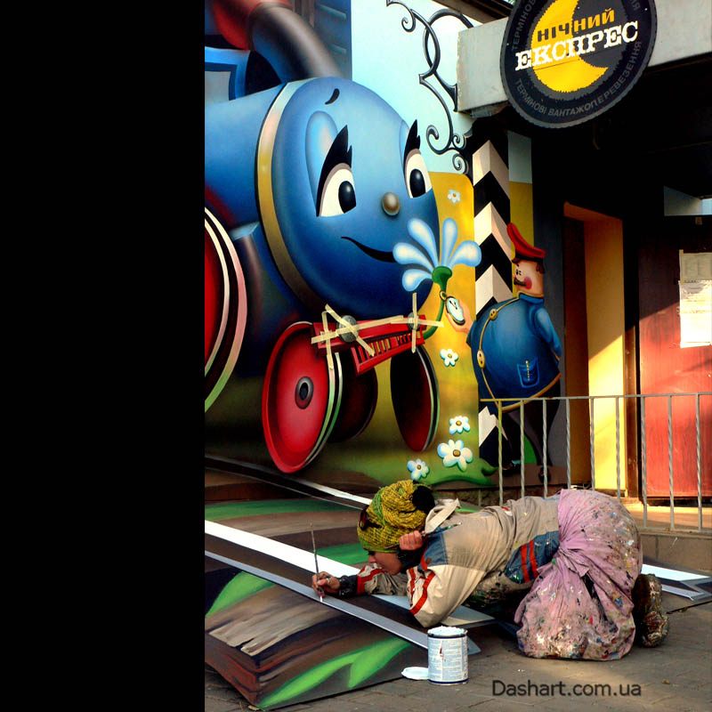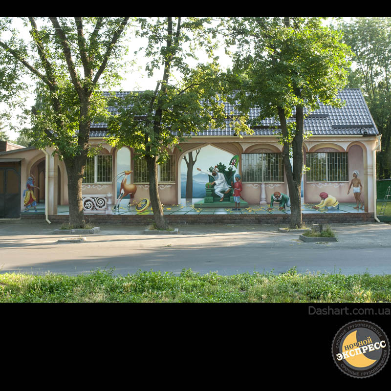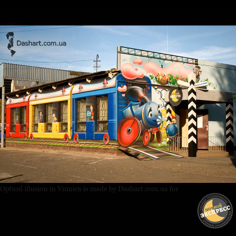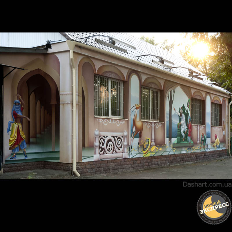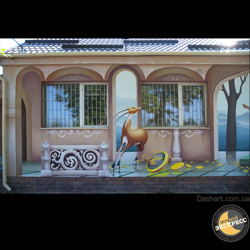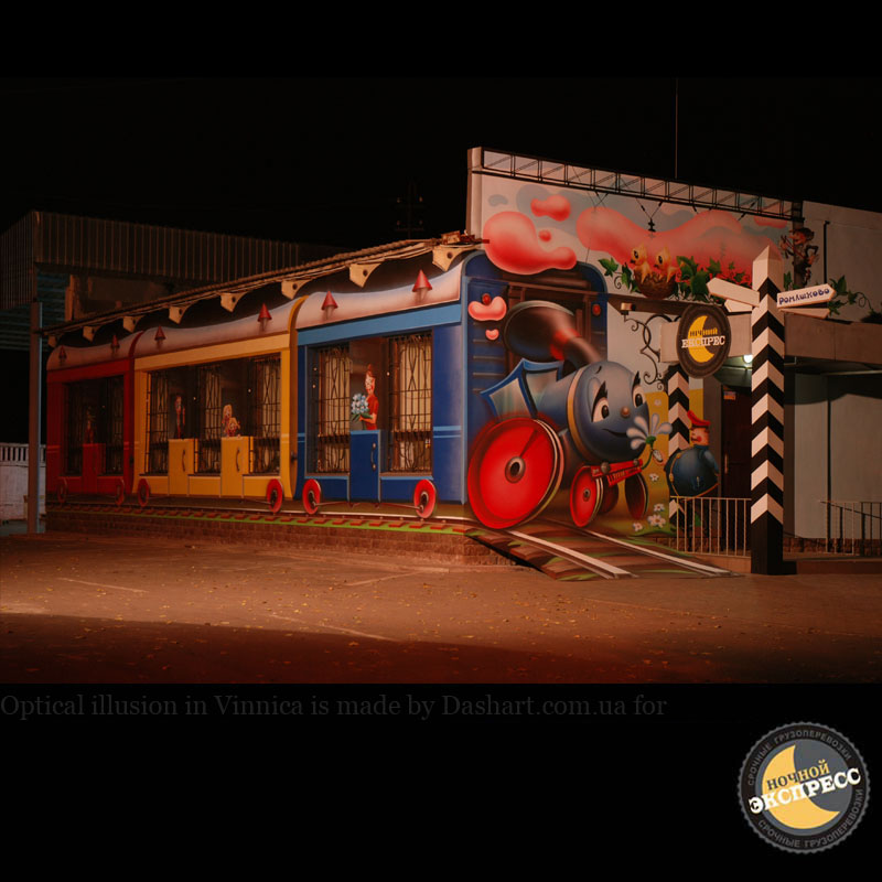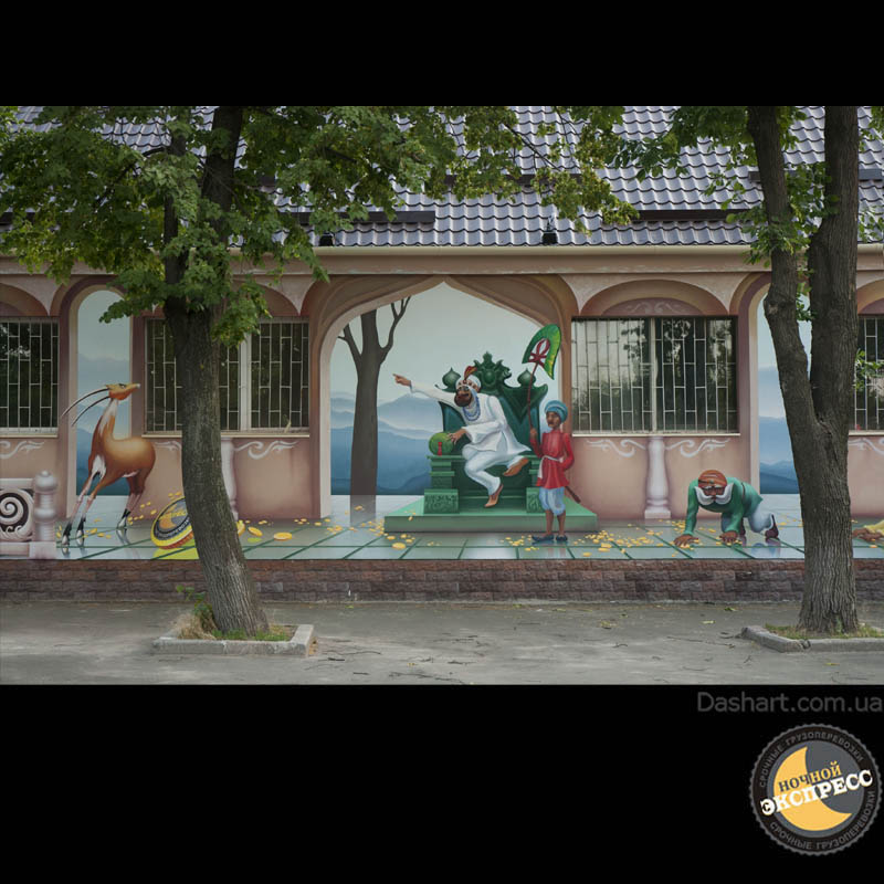 Художественная роспись стен для компании "Ночной Экспресс" долгое время казалась сном, чем угодно, но не реальностью. Оптические иллюзии теперь удивляют прохожих, не ожидающих повстречать летающую тарелку, Громозеку, паровозик из Ромашково, Золотую антилопу, Хаджу Настредина. Из города в город перевозим сказку. Люди в Херсоне, Днепропетровске, Виннице, Черкассах улыбаются чаще, а мы ищем новые методы для того, что бы обмануть Ваши глаза с помощью приемов 3Д аерографии и хорошего заказчика, компании грузовых междугородных перевозок « Ночной Экспресс». Только отпетые романтики могли задумать напомнить окружающим о любимых сказках и детских мечтах.
