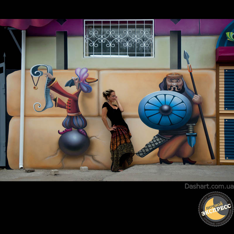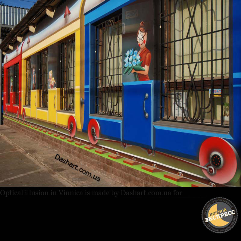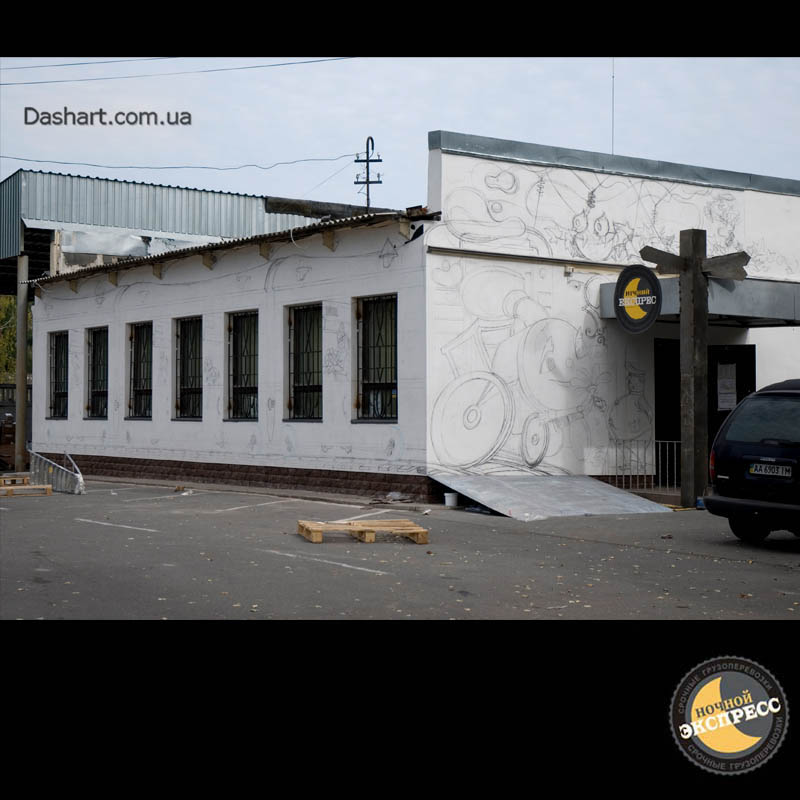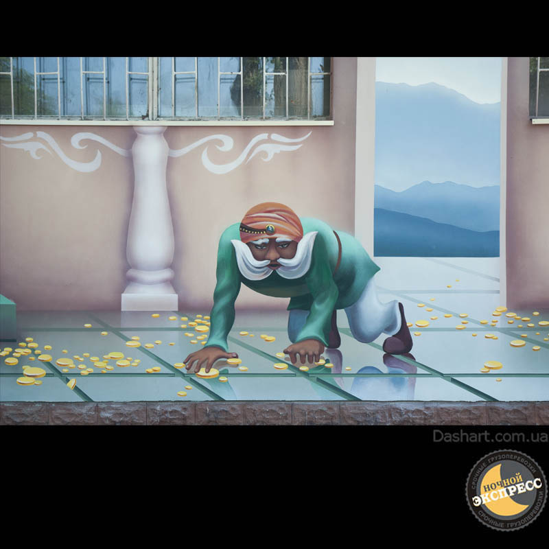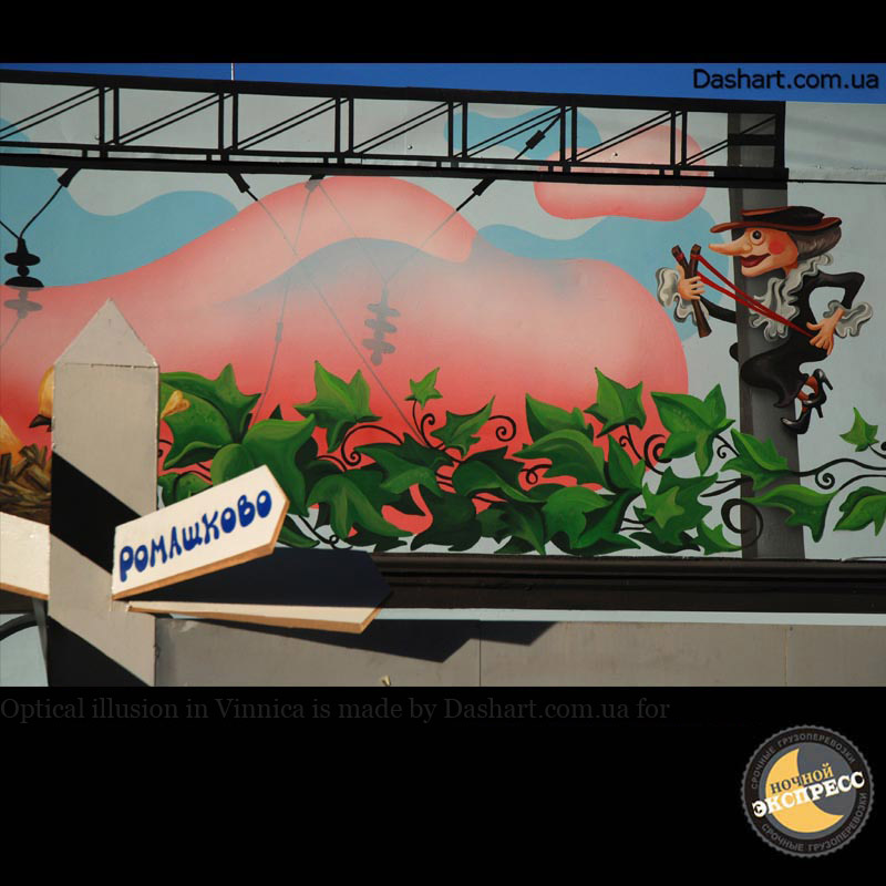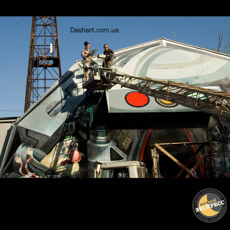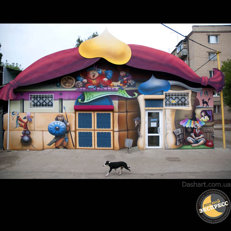 Художественная роспись стен для компании "Ночной Экспресс" долгое время казалась сном, чем угодно, но не реальностью. Оптические иллюзии теперь удивляют прохожих, не ожидающих повстречать летающую тарелку, Громозеку, паровозик из Ромашково, Золотую антилопу, Хаджу Настредина. Из города в город перевозим сказку. Люди в Херсоне, Днепропетровске, Виннице, Черкассах улыбаются чаще, а мы ищем новые методы для того, что бы обмануть Ваши глаза с помощью приемов 3Д аерографии и хорошего заказчика, компании грузовых междугородных перевозок « Ночной Экспресс». Только отпетые романтики могли задумать напомнить окружающим о любимых сказках и детских мечтах.