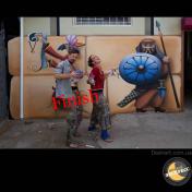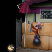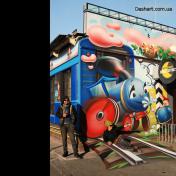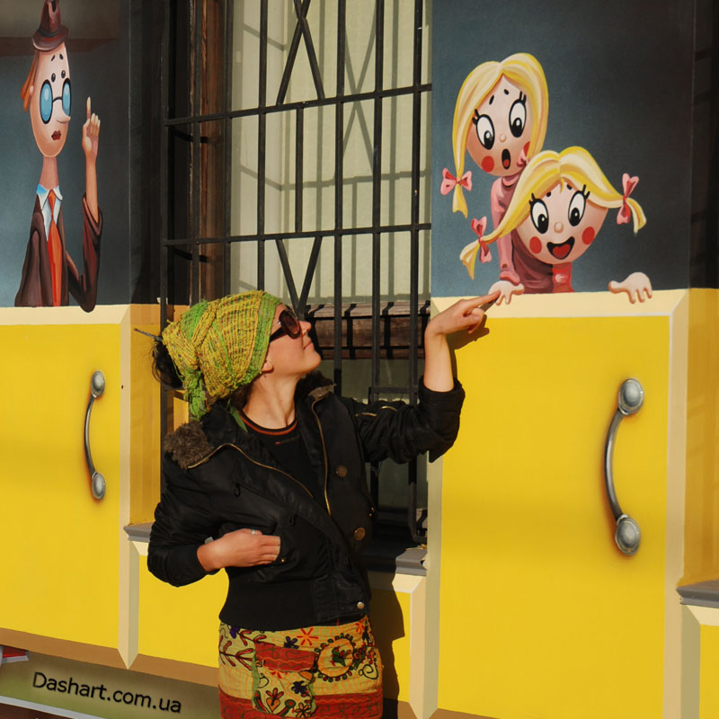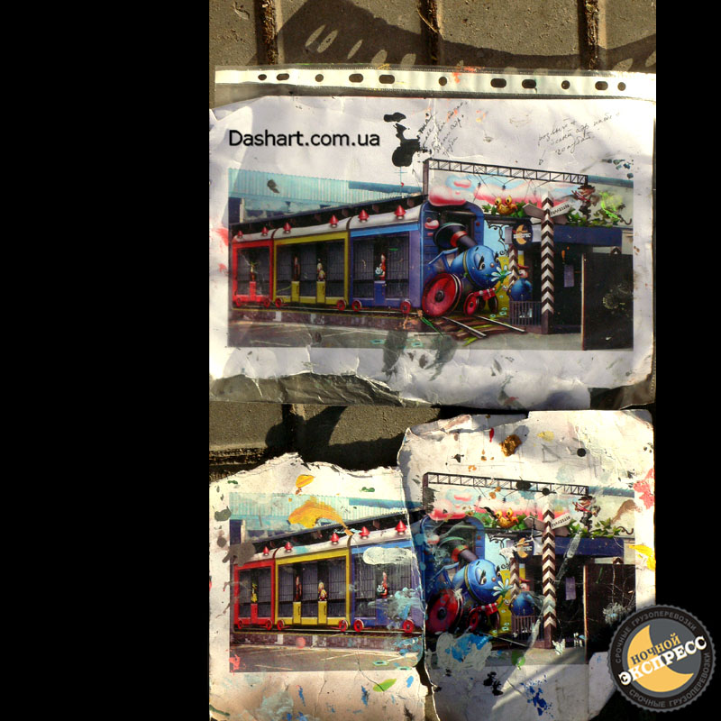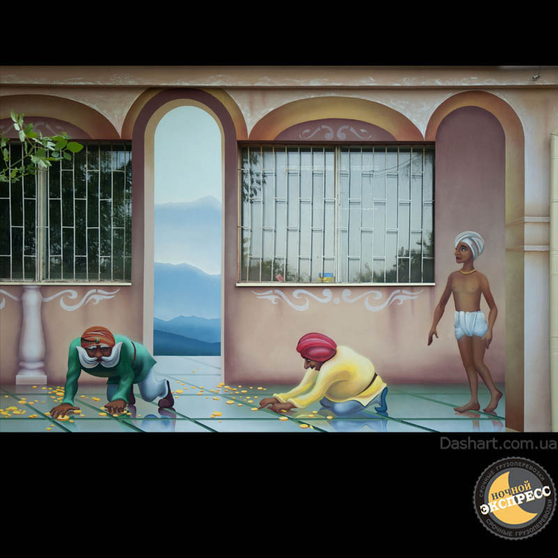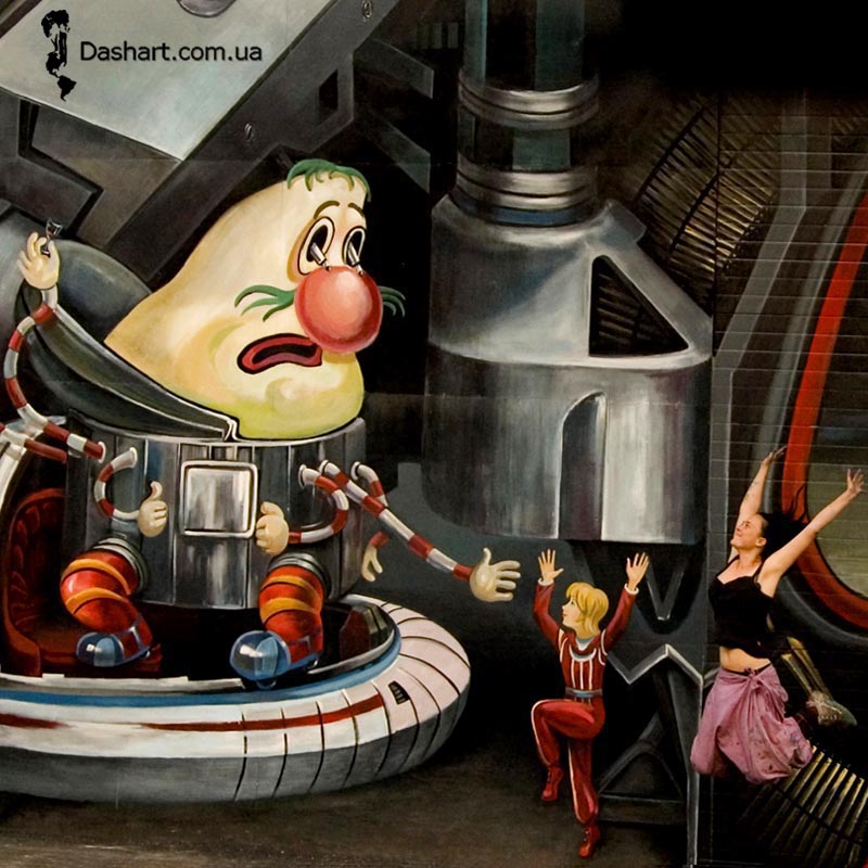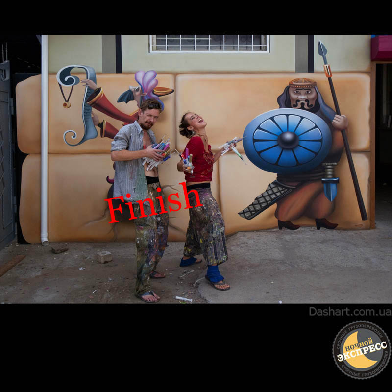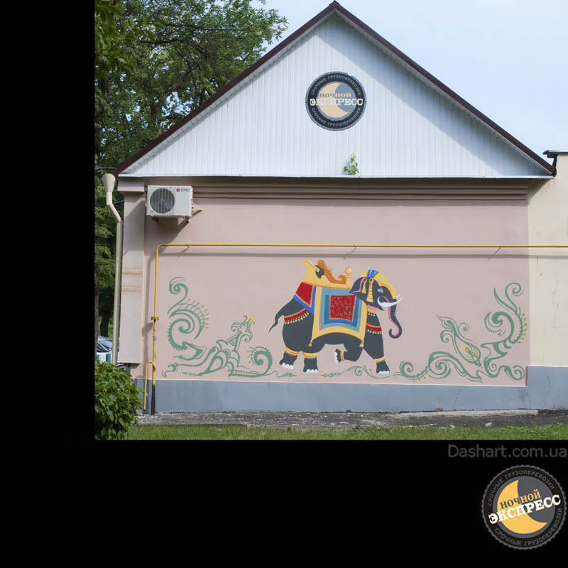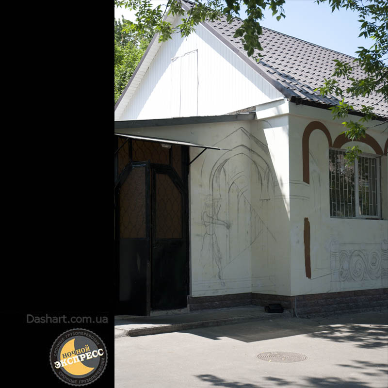 Художественная роспись стен для компании "Ночной Экспресс" долгое время казалась сном, чем угодно, но не реальностью. Оптические иллюзии теперь удивляют прохожих, не ожидающих повстречать летающую тарелку, Громозеку, паровозик из Ромашково, Золотую антилопу, Хаджу Настредина. Из города в город перевозим сказку. Люди в Херсоне, Днепропетровске, Виннице, Черкассах улыбаются чаще, а мы ищем новые методы для того, что бы обмануть Ваши глаза с помощью приемов 3Д аерографии и хорошего заказчика, компании грузовых междугородных перевозок « Ночной Экспресс». Только отпетые романтики могли задумать напомнить окружающим о любимых сказках и детских мечтах.